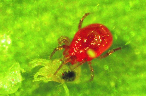 U ziet hier een plaatje van een roofmijt op een blad van een plant die een spintmijt leeg zuigt. De spintmijten zorgen voor schade aan de planten. Als de populatie te hard uitdijt, is er grote schade aan de gewassen. Kwaliteits- en opbrengstverliezen dus. Als je de schade met het blote oog ziet aan de gewassen, ben je al te laat. Een kweker moet dus in een vroeg stadium signaleren en ingrijpen. Dit doe je door met een loupe tussen de gewassen te lopen en regelmatig diverse plekken te onderzoeken of hetgeen je hebt uitgezet nog werkt en of er geen andere plagen zich op doen. Hoe eerder gesignaleerd, hoe beter.